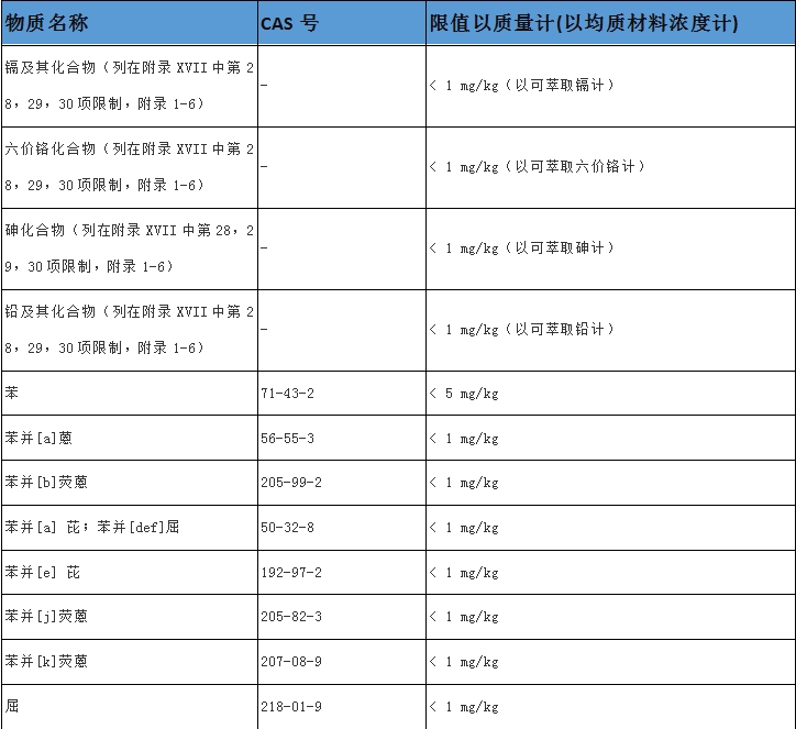 REACH法规附录12列出的受限物质,其限制浓度(以均质材料浓度计)列出如下: